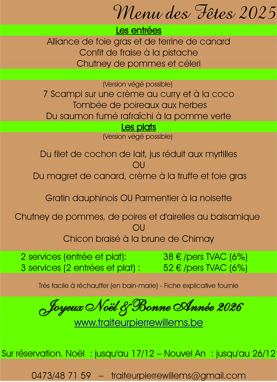 Pour un minimum de 12 personnes, dans le lieu de votre choix, nous vous proposons une cuisine fine, inventive et généreuse, dressée sur des assiettes élégamment décorées. Vous faites votre choix de plats et desserts dans la liste proposée et le dessert est toujours un assortiment de trois préparations (sauf demande de votre part). Il peut également être remplacé ou précédé par un fromage. Et parce que tout le monde n’a pas le même appétit, une repasse de la pièce principale est toujours prévue. Plusieurs formules vous sont proposées :